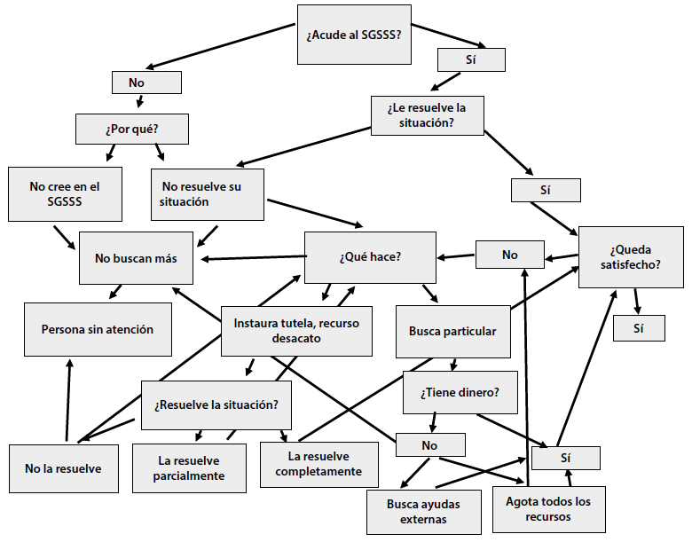 El esquema inicia con la pregunta: ¿acude usted al sgsss?, y de allí se desprenden las posiciones centrales: los que sí acuden y los que no lo hacen, cada grupo por diferentes circunstancias. Entre los que sí acuden se genera otra pregunta: ¿queda satisfecho? A lo que un grupo reducido responde que sí. Se trata de personas del régimen contributivo en las fases iniciales de la enfermedad, quienes reciben el diagnóstico por parte de un especialista de la empresa prestadora de servicios de salud (eps) o por un grupo de investigación de un centro universitario que los remite a su eps para la atención. Ellos se sienten satisfechos de lo que reciben. Así lo refiere la familia: “¿Qué eps tiene Luis? xxxx, menos mal” (E09 lg. Hombre mayor de 50 a. P. 29 Medellín).