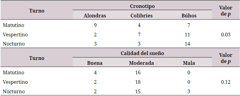 El cronotipo de los participantes del estudio fue: 54% nocturnos o “búhos”, 23% matutinos o “alondras” y 23% vespertinos o “colibríes”. Se identificó que el turno en que laboran los participantes tiene asociación con el cronotipo que presentan (p = 0.03). Más de la mitad (14/20) de los trabajadores del turno nocturno muestran cronotipo búho (tabla 2).