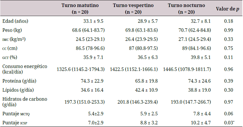 En la comparación por turno laboral no se identificaron diferencias en los indicadores antropométricos, de grasa corporal total o de consumo alimentario en los trabajadores (tabla1). Los trabajadores del turno nocturno presentaron el puntaje más alto en el icsp (p=0.03).
