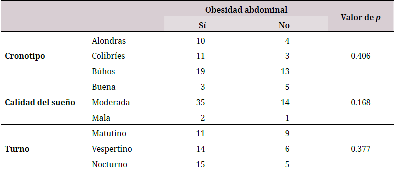 Por otra parte, un 66.7 % mostró obesidad abdominal, sin diferencia por cronotipo (p=0.406), calidad del sueño (p=0.168) o turno (p=0.377), véase tabla 3.