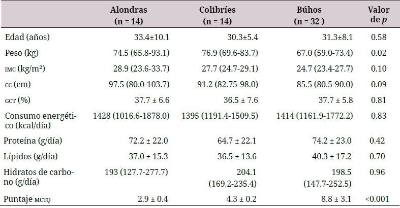 imc: índice de masa corporal; cc: circunferencia de cintura; gct: grasa corporal total; mctq: Munich ChronoType Questionnaire: ≤ 3:59 horas para cronotipo “matutino o alondra”, 4:00-4:59 para horas “vespertino o colibrí” y ≥5:00 horas para “nocturno o búhos”.