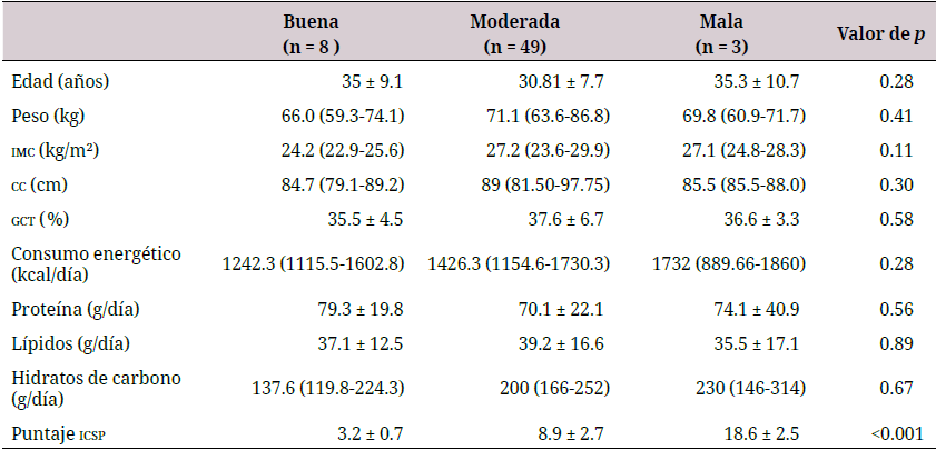 * Diferencias entre el grupo 1 y 3 por prueba post hoc de Bonferroni.Los participantes presentaron una mediana de imc de 26.30 kg/m² y un valor promedio de 37.45 ± 6.4% de masa grasa. La comparación por sexo mostró diferencias en todas las variables antropométricas estudiadas; mientras que el consumo energético y nutrimental de los hombres no fue diferente al de las mujeres, excepto en el consumo diario de proteína (varones 79.8 ± 20.67 g/día vs. mujeres 64.31 ± 21.9 g/día; p = 0.007). El 35% de los trabajadores del estudio presentó sobrepeso, y el 45%, normopeso; sin embargo, solo el 8.3% de los participantes presentó adecuado porcentaje de grasa corporal.