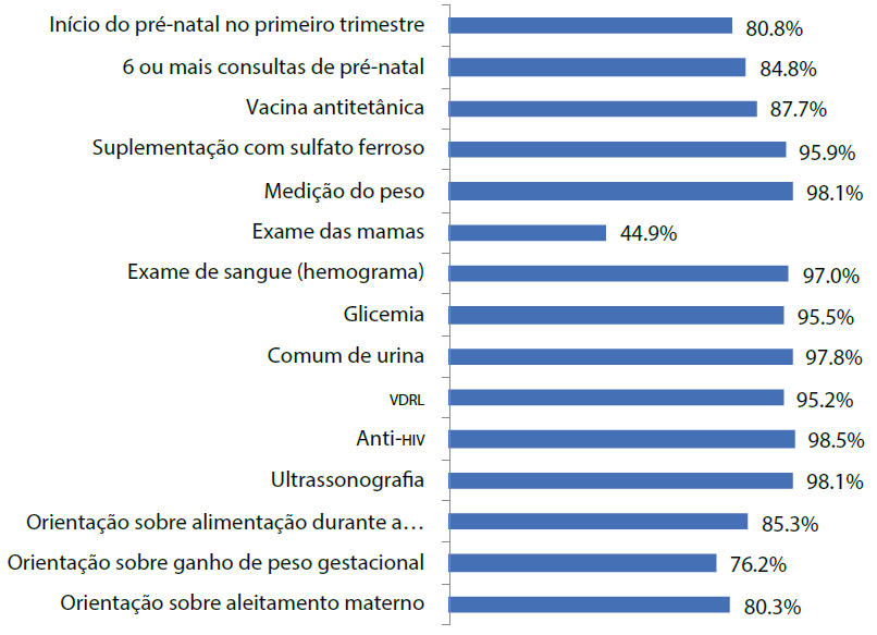 Das entrevistadas, 80.8% afirmaram ter iniciado o pré-natal no primeiro trimestre da gestação e 84.8% acusaram ter realizado no mínimo seis consultas. Procedimentos, exames e orientações recebidos durante o pré-natal mostraram altas prevalências de adequação, destacando-se a suplementação com sulfato ferroso, a medição do peso, a realização de exames (sangue, glicemia, urina, vdrl, anti-hiv) e a ultrassonografia que foram referidos por mais de 95% das entrevistadas. A atualização da vacina antitetânica foi citada por 87.7% das mulheres. O exame das mamas foi mencionado por 44.9% das entrevistadas. A proporção de mulheres que receberam orientações oscilou entre 76.2% (orientação sobre ganho de peso gestacional) e 85.3% (alimentação durante a gestação) (figura 1).