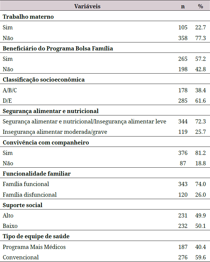 Participaram do estudo 463 mulheres com filhos menores de dois anos cujos dados foram obtidos em 46 equipes de saúde da esf e 17 creches vinculadas às mesmas no contexto do pse. Apesar da quantidade de entrevistas realizadas ser maior do que a amostra necessária, o número de observações apresentou pequenas variações segundo as características de cada indicador. Conforme ilustrado na tabela 1 a amostra do presente estudo foi composta principalmente por mulheres que não trabalhavam fora de casa (77.3%), beneficiárias do pbf (57.2%) e das classes socioeconômicas inferiores (61.6%). A proporção de mulheres que não conviviam com companheiro foi 18.8%, as de famílias disfuncionais 26.0% e de baixo suporte social 50.1%.