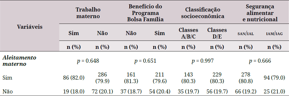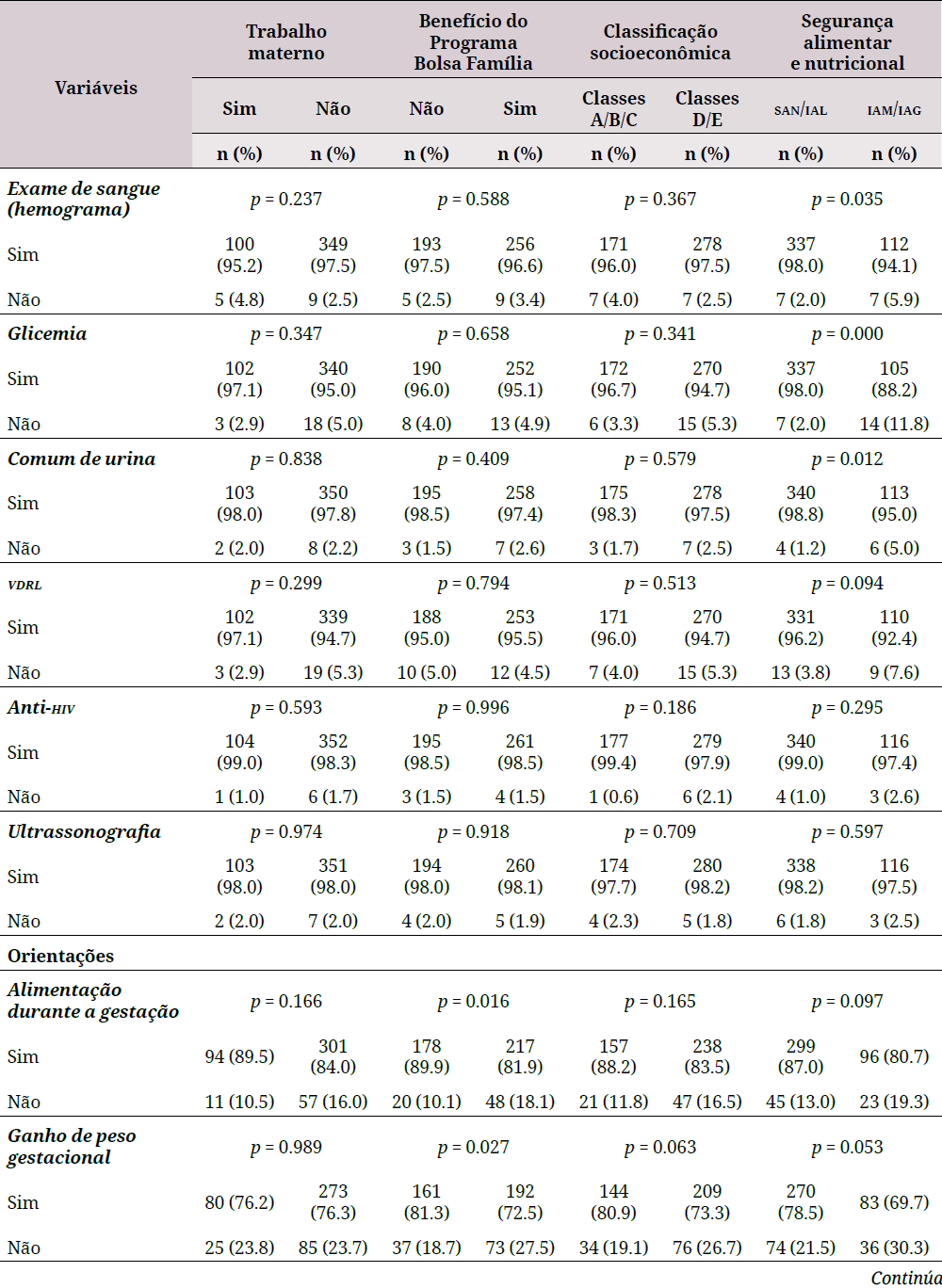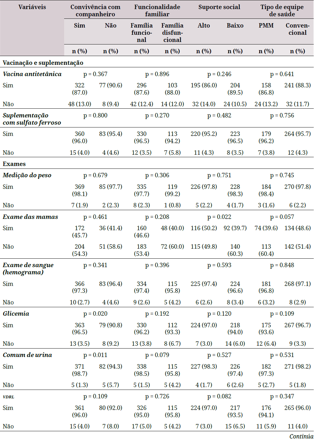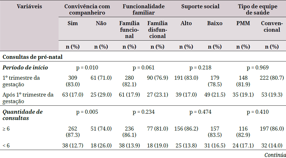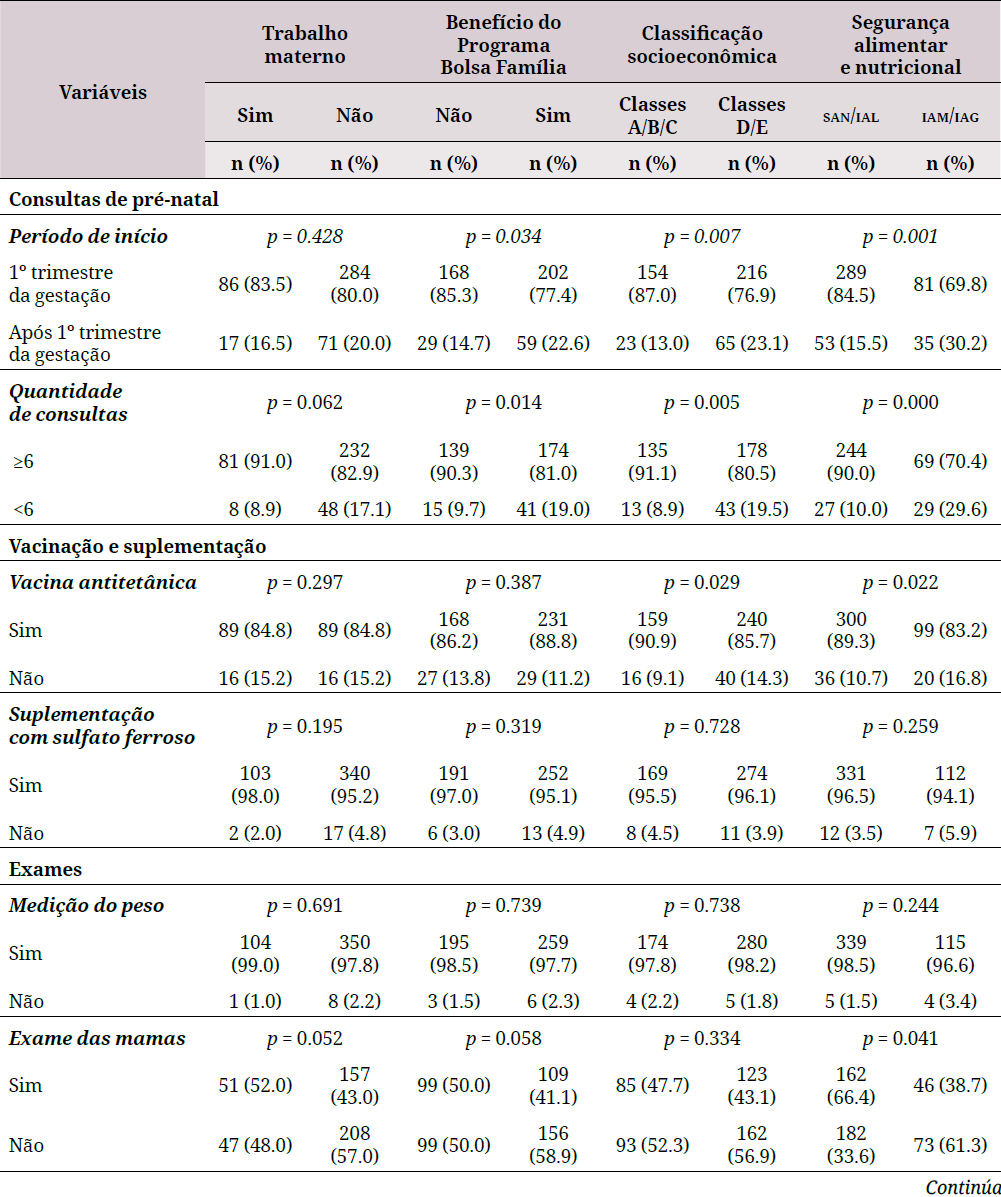 O grupo de variáveis independentes foi formado por: trabalho materno fora de casa, benefício do Programa Bolsa Família, classificação socioeconômica da família (A/B/C, ou D/E), segurança alimentar e nutricional da família (segurança alimentar e nutricional/insegurança alimentar leve ou insegurança alimentar moderada/grave), convivência da mãe com companheiro, funcionalidade familiar (funcional ou disfuncional), suporte social (alto ou baixo) e tipo de equipe de saúde da esf (pmm ou convencional). Os indicadores relacionados aos cuidados durante o pré-natal foram os seguintes desfechos de interesse: período de início (1º trimestre da gestação ou após 1º trimestre da gestação), quantidade de consultas (≥6 ou <6), imunização contra o tétano (sim ou não), suplementação com sulfato ferroso (sim ou não), medição do peso (sim ou não), exame das mamas (sim ou não), hemograma (sim ou não), glicemia (sim ou não), exame comum de urina (sim ou não), vdrl (sim ou não), anti-hiv (sim ou não), ultrassonografia (sim ou não) e recebimento de orientações sobre alimentação durante a gestação (sim ou não), ganho de peso gestacional (sim ou não) e aleitamento materno (sim ou não).