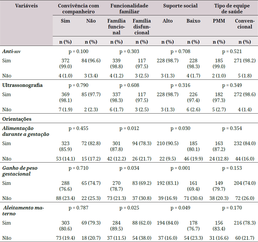 As análises relacionadas às variáveis de apoio social mostraram associação positiva da convivência com companheiro com o início do pré-natal no primeiro trimestre (p = 0.010), com o cumprimento de seis ou mais consultas (p = 0.005) e com a realização dos exames de glicemia (p = 0.020) e de urina (p = 0.011). A realização do exame das mamas foi mais frequente entre as mães com alto suporte social (p = 0.022). O recebimento de orientações durante as consultas associou-se à funcionalidade familiar e ao suporte social, com maiores proporções dos desfechos nas mulheres em melhores condições de apoio social. Não houve diferença nos indicadores da assistência pré-natal de acordo com o tipo de equipe de saúde (tabela 3).