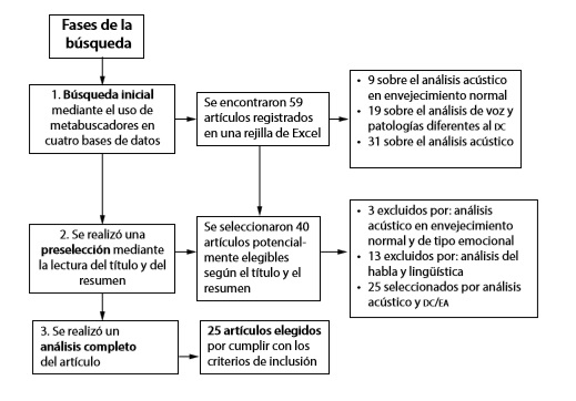El método aplicado para este estudio se basó en los parámetros PRISMA (50). Se llevó a cabo un estudio de revisión sistemática de la literatura sobre los hallazgos del análisis acústico en el DC. Dos evaluadores independientes calcularon el riesgo de sesgo y consultaron los resúmenes publicados entre febrero del 2008 y julio del 2020 en las siguientes bases de datos: PlosOne, Science Direct, Pubmed/PMC y Google Scholar, tanto en inglés como en español. Los metabuscadores fueron: voice analysis, acoustic analysis, mild cognitive impairment, Alzheimer’s disease, voice production y prosody; todos incluidos en los descriptores en Ciencias de la salud (DeCS). Se encontraron 59 publicaciones científicas en idioma inglés y español, de las cuales solo 25 cumplieron con los criterios de inclusión (figura 1).