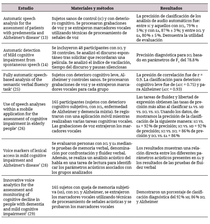 Para citar este artículo:: Rodríguez-Fandiño JC, Salazar Montes AM. Análisis acústico en el diagnóstico del deterioro cognitivo: revisión sistemática de la literatura, 2008-2020. Rev Cienc Salud. 2021;19(3):1-16. https://doi.org/10.12804/revistas.urosario.edu.co/revsalud/a.9877