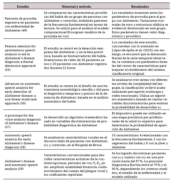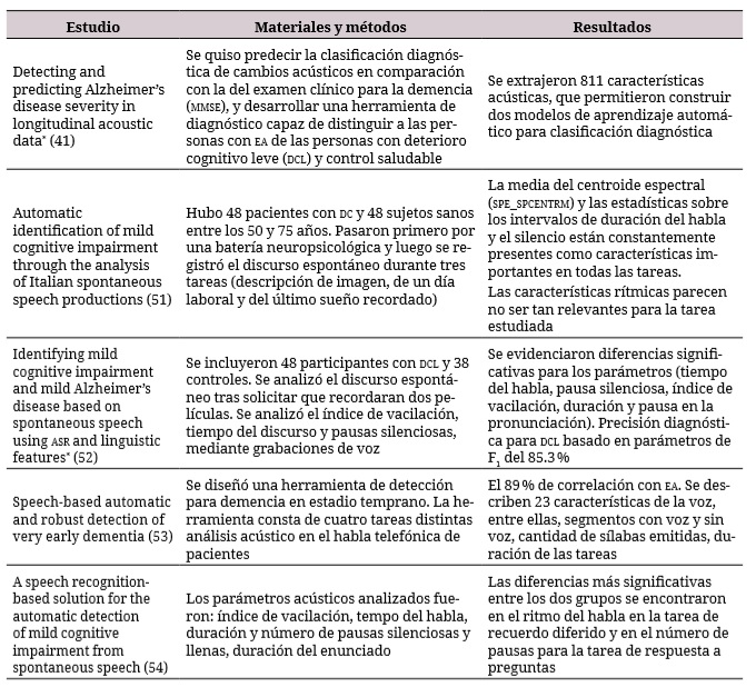 Los estudios de Meilán et al. lograron identificar ocho parámetros importantes relacionados con alteraciones en la voz correspondientes a individuos con DC: a) porcentaje del periodo sin emisión de sonido, b) Brillan Apq11, c) brillan Apq3, d) número de saltos de voz, e) desviación estándar de F3., f) edad, g) relación de ruido armónico y autocorrelación y h) discriminación del tipo de participantes —en el 91.2 % de los casos; 90.05 % en la validación cruzada— (27,28,39). Estos parámetros lograron discriminar a los participantes con envejecimiento normal y Alzheimer hasta en un 97 %, y con DC, en más del 76.3% de los casos (35,38-40). Resultados similares se evidenciaron en otros estudios con un 96% a 75% de precisión diagnóstica (14,41,52). Igualmente, se debe resaltar que los estudios del análisis acústico han resultado ser útiles en la correspondencia con otras alteraciones neurológicas, como el Párkinson, la esquizofrenia, la enfermedad de Huntington, la demencia frontotemporal y la demencia con cuerpos de Lewy, y constituyen una medición prometedora, económica y rápida para el apoyo de la evaluación clínica tradicional de diversos trastornos psiquiátricos (13,21,43,44,51,52,55,56,60,61,65). Pese a lo anterior, la mayor parte de los estudios revisados fueron de mediciones transversales, de casos y controles, que devienen en una limitación metodológica a la hora de generalizar los resultados, a lo que se sugerirían estudios de seguimiento de cohorte con mediciones repetidas, que aseguren con mayor precisión la predicción y clasificación diagnóstica.