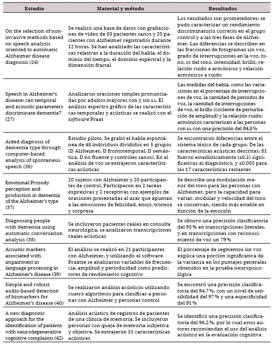 Los autores extrajeron los datos utilizando una matriz de Excel, donde se describió el contenido de los artículos seleccionados, incluyendo autores, título, objetivo del estudio, material y métodos, resultados y conclusiones. Después se leyeron los títulos y resúmenes de los artículos, considerando los criterios de inclusión. Adicionalmente, leyeron de forma completa todos los estudios para corroborar la claridad de los resultados. Se incluyeron estudios de comparación entre grupos, casos y controles y de desarrollo tecnológico que hubieran realizado análisis acústico en población con DC (tabla 1) y enfermedad de Alzheimer (tabla 2). Por último, se consultó un tercer evaluador que corroboró la calidad de la información.