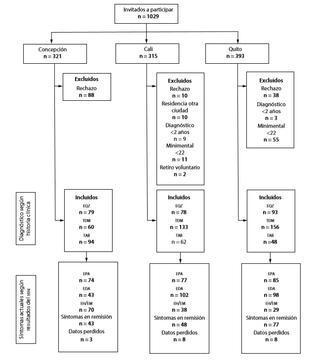 Se realizó un estudio correlacional, de corte trasversal (23). Se invitó a participar de manera voluntaria, mediante la firma de un consentimiento informado, a personas de ambos sexos, con edades entre 18 y 65 años, con diagnósticos de trastorno depresivo mayor (código 296.xx), esquizofrenia (código 295.xx) y trastorno afectivo bipolar (códigos 296.xx y 296.89), de acuerdo con los criterios del Manual diagnóstico y estadístico de los trastornos mentales, cuarta edición revisada (dSM IV-r) (24), que asistieron a consulta ambulatoria en el servicio de psiquiatría, Centros de Salud Mental Comunitaria de la provincia de Concepción (Chile); hospitales psiquiátricos pertenecientes al Ministerio de Salud Pública del Ecuador (zona 9 del Distrito Metropolitano de Quito), y los servicios ambulatorios de un centro hospitalario y centro de día reconocidos por la Secretaría de Salud Pública Municipal de Cali (Colombia).