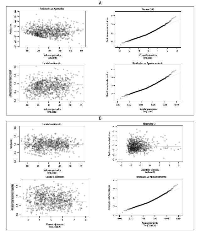Por ello, se comprobó una solución basada en la transformación a raíz cuadrada que conserva las variables explicativas y denotó un ajuste de los residuos a los supuestos de regresión. La prueba de Shapiro-Wilk determinó normalidad de los residuos (W = 0.9966; . = 0.09962); sin embargo, al comparar los valores del coeficiente de determinación de ambos modelos, no se identificaron variaciones significativas (R² modelo reducido = 0.3275 vs. R² modelo transformado = 0.3216), por lo que para efectos de interpretación de los coeficientes se mantiene el modelo reducido.