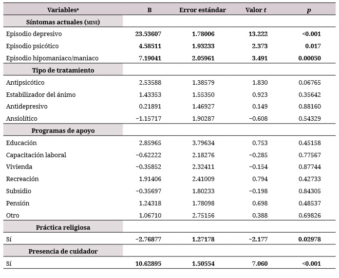 . = 0.00162); presencia de episodio depresivo actual (β = 23.26; t = 13.186; . ≤ 0.01); presentar episodio psicótico actual (β = 4.795; t = 2.512; . = 0.0122); presentar episodio hipomaniaco/ maniaco actual (β = 7.498; t = 3.711; . = 0.00022); tener práctica religiosa al menos una vez al mes (β = −2.834; t = −2.234; . = 0.0257), y requerir el apoyo de un cuidador (β = 10.363; t = 6.933; . < 0.001).