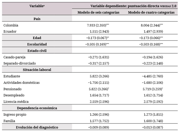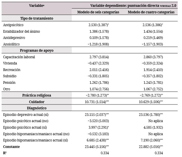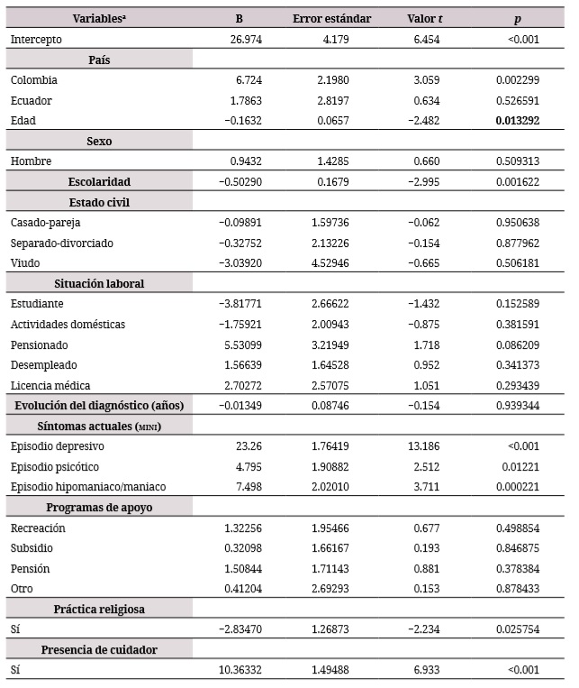 El modelo multivariado inicial, basado en cuatro categorías diagnósticas, consideró variables sociodemográficas, clínicas y psicosociales con el método de introducción progresiva (forward stepwise). Se identificaron como variables explicativas el país (Colombia: β = 8.0035; t = 4.562; . = 0.00067), escolaridad (β = −0.5029; t = −2.95; . = 0.00958); episodio depresivo actual (β = 23.536; t = 13.222; . ≤ 0.01); episodio psicótico actual (β = 4.585; t = 3.373; . = 0.017); episodio hipomaniaco/maniaco actual (β = 7.190; t = 3.491; . = 0.00050); tener práctica religiosa (β = −2.768; t = −2.177; . = 0.0297), y tener un cuidador (β = 10.628; t = 7.060; . ≤ 0.01). El coeficiente de determinación fue de 0.3337 (F [32, 751] = 16.83; . < 0.001; R²∆ = 0.30.53), lo que significa que el modelo explica el 33.37 % de la discapacidad de las personas con TMG de los tres países (tabla 4).