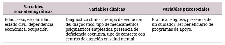 Los evaluadores fueron profesionales de la salud. En Chile, una neuropsicóloga y un terapeuta ocupacional; en Colombia, una médica general y un terapeuta ocupacional, y en Ecuador, tres psicólogas. Se ofreció entrenamiento de 20 horas presenciales, mediante un protocolo operativo estandarizado para la administración de los instrumentos que incluyó los temas de módulos de la CIf, características y formas de administración de los instrumentos, análisis y sistematización de los datos. La formación fue certificada por el Departamento de Psiquiatría y Salud Mental de la Universidad de Concepción (Chile). Como variables independientes se consideraron variables sociodemográficas, clínicas y psicosociales resumidas en la tabla 1.