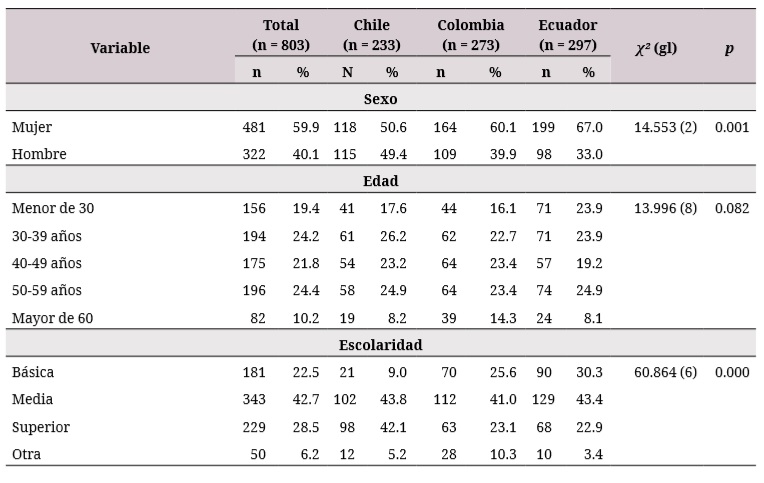En total participaron en el estudio 803 personas (tabla 2). Respecto al sexo, el 59.9 % correspondió a mujeres. Se identificaron diferencias estadísticamente significativas entre los tres países (. = 0.001), fundamentadas en la mayor participación de mujeres en la muestra de Colombia (60.1 %) y de Ecuador (67.0 %).
