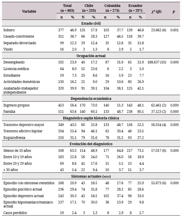 A partir de los reportes de la historia clínica de los participantes, la muestra total quedó conformada por personas con diagnóstico de trastorno depresivo mayor (43.5 %), esquizofrenia (31.1 %) y trastorno afectivo bipolar (25.4 %). Se identificaron diferencias estadísticamente significativas entre los tres países (. < 0.001), considerando que en Colombia y Ecuador predominaron casos de personas con trastorno depresivo mayor con un 48.7 % y un 52.5 %, respectivamente; mientras que en Chile predominaron casos de personas con trastorno afectivo bipolar, con un 46.7 %.