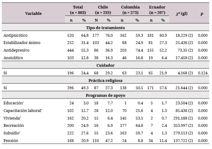 Para caracterizar la condición clínica actual, se emplearon los módulos correspondientes a episodio depresivo, episodio psicótico y episodio hipomaniaco/maniaco, todos incluidos en la MINI. Se identificaron diferencias estadísticamente significativas (. < 0.001), puesto que, del total de la muestra, el 20.9 % reportó haber resuelto el síntoma, el 29.4 % presentaba episodio psicótico, el 30.3 % tuvo episodio depresivo, sobre todo en la muestra de Colombia y Ecuador, y el 17.1 % presentó episodio hipomaniaco/maniaco, más frecuente en la muestra de Chile. El total de la muestra reportó el consumo actual de medicamentos de uso psiquiátrico, por lo que se decidió clasificarlos de acuerdo con su función principal. Se identificaron diferencias estadísticamente significativas entre los tres países en el uso de tratamiento antipsicótico y de tratamiento estabilizador del ánimo, ambos de mayor frecuencia en la muestra de Chile (. < 0.001); mientras que el uso de tratamiento antidepresivo fue más frecuente en las muestras de Colombia y Ecuador. Finalmente, el uso de tratamiento ansiolítico fue más frecuente en la muestra de Colombia (. < 0.001).