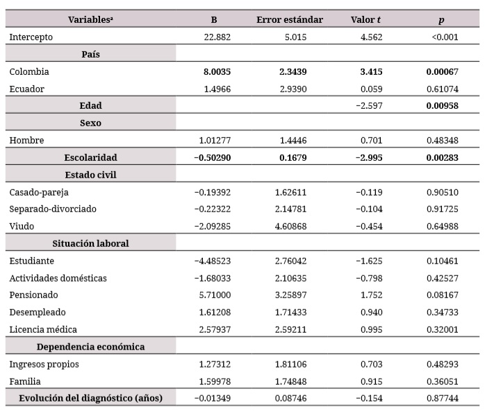 A partir de los resultados del análisis de importancia de factores, se generó un nuevo modelo multivariado que incluyó las variables explicativas país (Colombia: β = 6.724; t = 6.454; . < 0.001), edad (β = −0.163; t = −2.482; . = 0.0132), escolaridad (β = −0.5029; t = −2.995;
