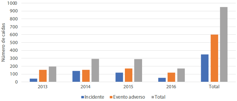 Si bien 951 caídas pueden representar un bajo número respecto al total de ingresos y egresos hospitalarios en el periodo estudiado, este tipo de eventos, en gran medida prevenibles, representan la persistencia de esta situación en la institución, pese a la implementación de medidas dirigidas a eventos de interés prioritario para la seguridad del paciente, desde la formulación de la política institucional de seguridad del paciente, pasando por la capacitación permanente del recurso humano, la promoción de prácticas seguras, las adaptaciones en infraestructura, hasta la adquisición de dispositivos y tecnologías de apoyo asistencial (por ejemplo, grúas para la movilización de pacientes).