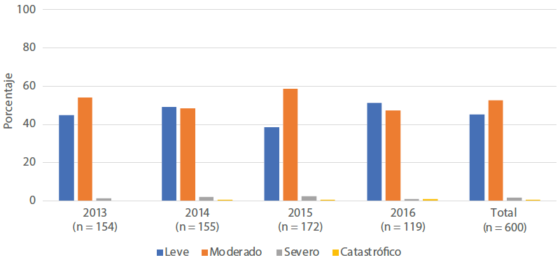 Se estudiaron un total de 951 caídas ocurridas entre 2013 y 2016. De estas, el 63.1% (600) se clasificaron como eventos adversos; mientras que el 36.9% (351) fueron incidentes (figura1). Fueron los años 2014 y 2015 en los que se informó el mayor número de caídas (2014: 30.9%; 2015: 30.5%). Según la gravedad, el 54.2% de todos los eventos adversos se clasificaron como “moderados” y “severos” (figura 2).