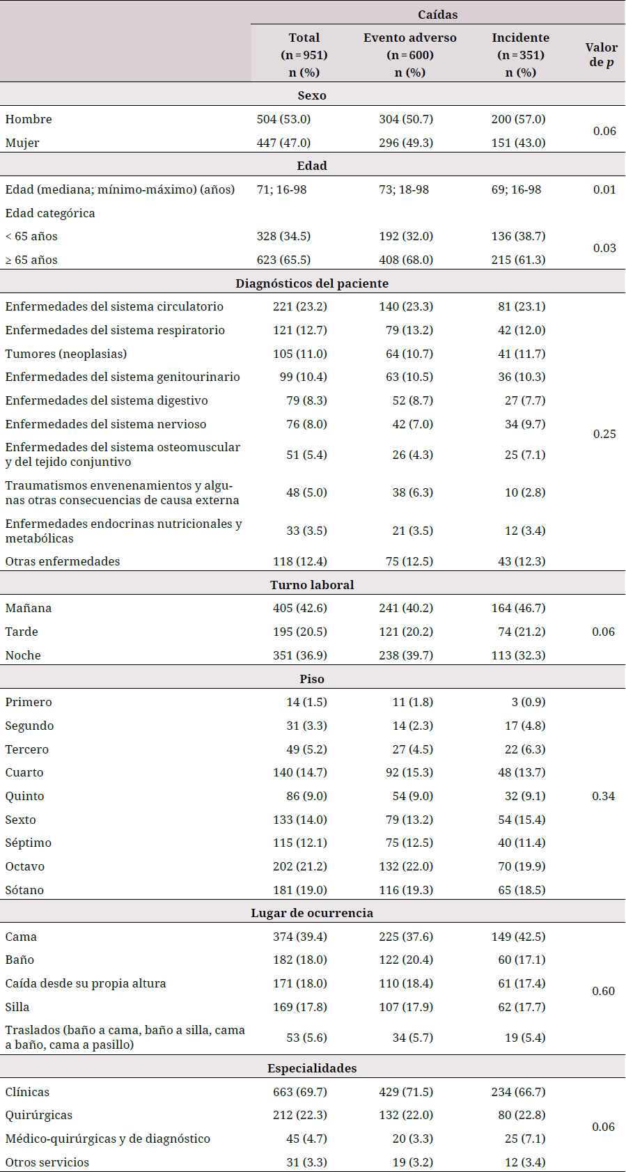 Como variables independientes se consideraron las características demográficas de los pacientes: sexo (hombre o mujer), edad continua, edad categórica (menores de 65 años; mayores o igual a 65 años) y diagnóstico (enfermedades del sistema circulatorio; del sistema respiratorio; tumores [neoplasias]; del sistema genitourinario; del sistema digestivo; del sistema nervioso; del sistema osteomuscular y tejido conjuntivo; traumatismos, envenenamientos y algunas otras consecuencias de causa externa; del sistema endocrino, nutricionales y metabólicas; otras enfermedades). Asimismo, se tuvieron en cuenta características relacionadas con la prestación de los servicios involucrados en el suceso: turno laboral: mañana (7:00a.m. a 1:00 p.m.), tarde (1:00 a 7:00 p.m.) y noche (7:00 p.m. a 7:00 a.m.); especialidad médica: clínicas, quirúrgicas, médico-quirúrgicas y de diagnóstico, otros servicios; piso: primero al octavo y sótano; lugar de ocurrencia: cama, baño, caída desde su propia altura, silla, traslados (baño a cama, baño a silla, cama a baño, cama a pasillo). Como variables dependientes se consideraron las características de las caídas: clasificación (evento adverso vs. incidente) y severidad de las caídas (leve, moderada, severa y catastrófica).