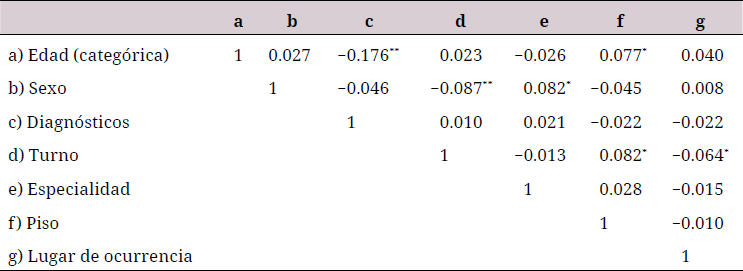 Con relación a la prestación de los servicios, la mayor proporción de caídas se presentó durante los turnos de la mañana (42.6%) y de la noche (36.9%). Los pisos donde se exhibieron las caídas fueron principalmente, el octavo (21.2%), el sótano (19.0%), el cuarto (14.7%) y el sexto piso (14.0%). Estas se produjeron mientras el paciente se encontraba en la cama (39.3%), el baño (18.0%), desde su propia altura (18.0%) y la silla (17.8%). Según el servicio médico, fueron las especialidades clínicas (69.7%) y las quirúrgicas (22.3%) las que reportaron el mayor número de caídas (tabla 1). También se encontraron correlaciones leves entre algunas variables independientes (tabla 2).