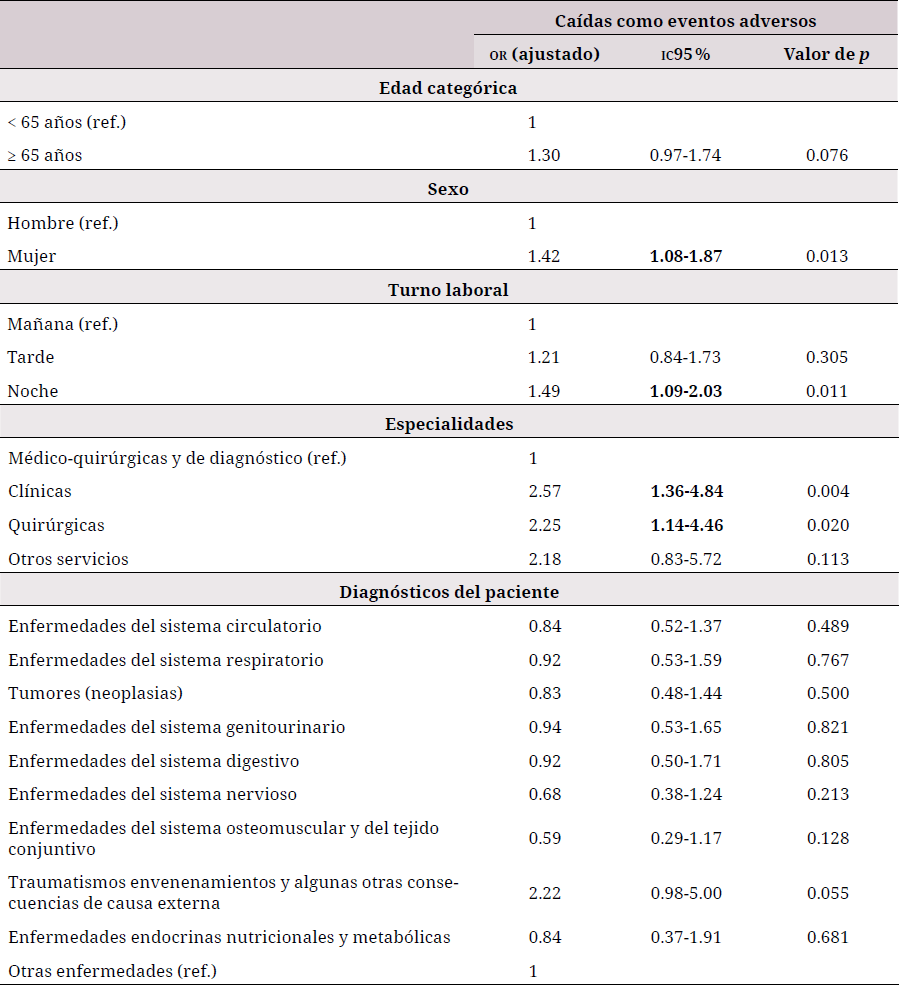 En el modelo logístico multivariado, las variables que se asociaron con un mayor riesgo de caídas que culminaron como eventos adversos fueron: ser mujer (aor=1.42; ic95%: 1.08-1.87), el turno laboral noche (aor=1.49; ic95%: 1.09-2.03), así como las especialidades clínicas (aor=1.36; ic95%: 1.36-4.84) y quirúrgicas (aor =2.25; ic95%: 1.14-4.46). La prueba de bondad de ajuste de Hosmer y Lemeshow estimó valores de p superiores a 0.05 (estadístico de la prueba=7.327; gl=8; p=0.502), lo que indicó que los datos se ajustaron al modelo logístico. Se obtuvo un factor de inflación de la varianza de 1.92, que mostró una leve multicolinealidad entre las variables independientes introducidas al modelo logístico (tabla 3).