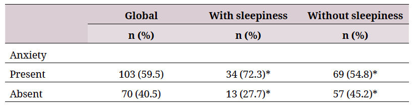 Of the 173 students, 27.2% presented sleepiness according to the Epworth Sleepiness Scale, of which 15 students were classified as having excessive sleepiness. On the other hand, 59.5% of the students suffered from anxiety, with 33 students having moderate and 17 having severe anxiety according to BAI.