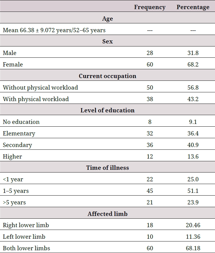 Regarding patients’ sociodemographic and clinical characteristics, the mean age was 66.38 years (±9.072), with a range of 52–65 years. Of the patients, 68.2% were female, 56.8% had a current occupation without physical workload, 40.9% had a secondary level education, 51.1% reported a time of illness of 1–5 years, and 68.8% presented with both lower limbs affected by knee osteoarthritis (Table 1).