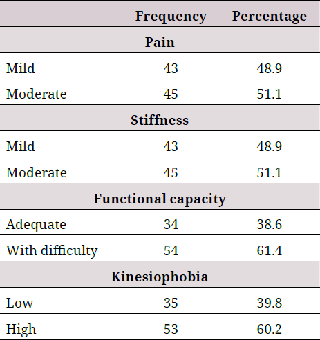 On the other hand, regarding the primary variables (Table 2), 51.1% of the evaluated patients presented with moderate pain, 51.1% with moderate joint stiffness, 61.4% with functional capacity difficulty, and 60.2% with a high level of kinesiophobia.