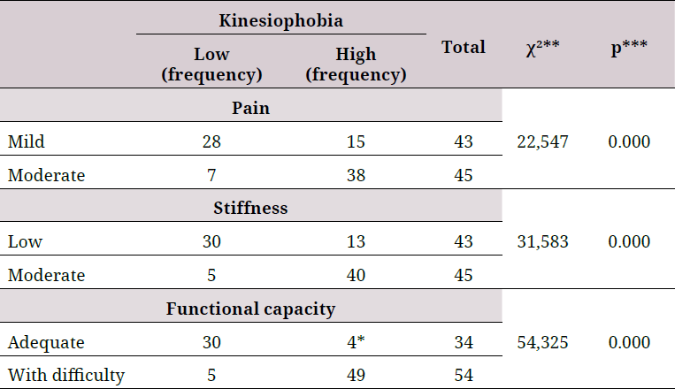 For the analysis of the association between pain, stiffness, and functional capacity along with kinesiophobia in patients with knee osteoarthritis, a p value of < 0.01 was obtained using Pearson’s chi-square test. In addition, higher rates of high kinesiophobia were found in levels of moderate pain, moderate stiffness, and functional capacity with difficulty (Table 3).