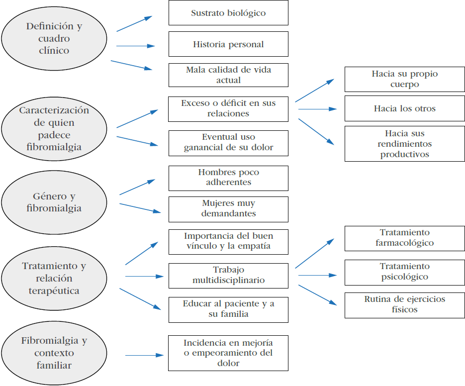 En la figura 1 se resumen los principales hallazgos obtenidos de la investigación. Luego se analizan detalladamente las cinco categorías temáticas más relevantes observadas en las entrevistas: 1) definición y cuadro clínico, 2) caracterización de quienes presentan fibromialgia, 3) género y fibromialgia, 4) tratamiento y relación terapéutica y 5) fibromialgia y contexto familiar.