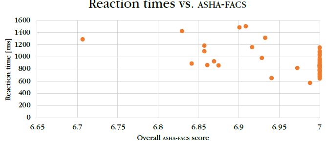 Since statistically significant differences in response times were found for positive and negative words, with faster responses for positive words, the relationship of this emotional valence effect with communicative functionality as measured by the ASHA-FACS was also analyzed. For this purpose, the difference between the averages of the reaction time for negative and positive words was calculated for each older-aged participant. This difference reflects the effect of valence at the individual level. These differences were correlated with the overall ASHA-FACS score. However, Spearman's correlation was small (-0.076) and not statistically significant.