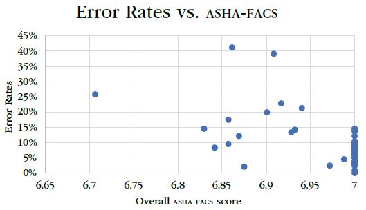 It can be observed that older adults with higher percentages of LDT error rates scored below 7 points (Figure 2), a trend similar to that seen with reaction times. This indicates that participants who make more errors in LDT also tend to need or require minimal assistance from a third party in their communicative and social functioning (as reflected in the ASHA-FACS). The Spearman correlation between the error rate and the overall ASHA-FACS score of each individual was -0.491, significantly different from zero (p < 0.001), and confirms this observation.