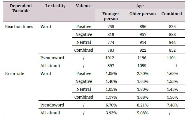 The participants (young adults and older adults) identified the words faster and more effectively than the pseudowords. These findings support those of Imbir, Spustek, and Zygierewicz who, in an experimental LDT task with emotional words, found lower reaction times and error rates in word identification 31. This lexicality effect confirms that participants performed LDT based on this paradigm in psycholinguistics.