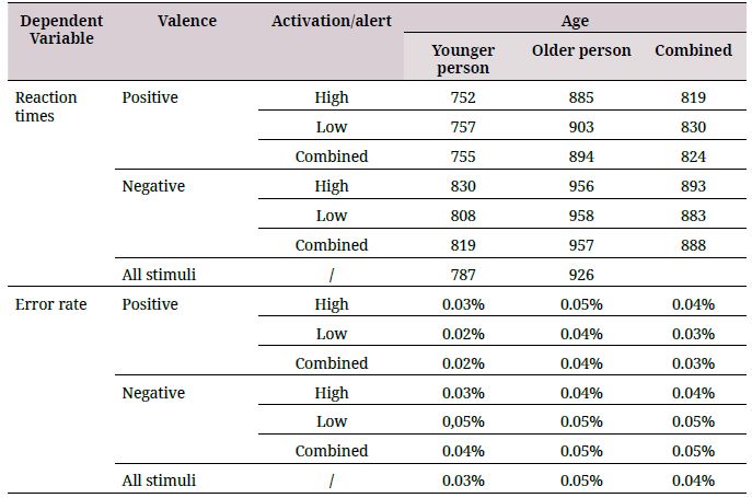 The main effect of age was statistically significant (F(1, 98) = 13.2, p < 0.001), with a = 922 ms for older adults and = 783 ms for younger adults (Table 1, "Word/combined" row). There was no statistically significant effect on the interaction of the valence-PoNeNeu with the age condition (F (2, 196) = 0.030, p = 0.970).