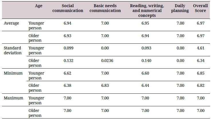 Older adults obtained averages <7 points for the social communication domain and the reading, writing, and numerical concept domain, indicating that some of them may need help or directions from a family member or third party. This was also the case for younger adults. Older and younger adults showed skills and total independence in the basic needs communication domain and the daily planning domain (see Table 3).