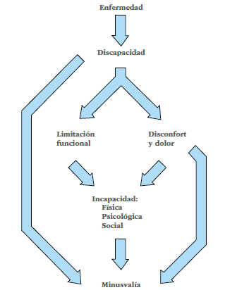 Entre los instrumentos subjetivos para medir la necesidad de estética dental se encuentran el Índice de Estética Dental (IED), generalmente utilizado en dentición permanente y que ha recomendado la Organización Mundial de la Salud (OMS) para su aplicación en estudios epidemiológicos, y el cuestionario Perfil de Impacto de Salud Oral, para medir la calidad de vida relacionada con salud, cuya versión paraguaya se validó recientemente (OHIP-14Py) (6-0). Este último cuestionario cuenta con 14 preguntas agrupadas en 7 dominios: limitación funcional, dolor físico, malestar psicológico, incapacidad física, incapacidad social, incapacidad psicológica y minusvalía. Mide el impacto negativo que pueden tener las patologías bucodentales en la vida diaria del adulto. Está basado en el modelo conceptual de Locker (1998), que intenta registrar las consecuencias de las enfermedades en el plano funcional y su afectación psicosocial (figura 1), a su vez basado en el modelo de la OMS 10,11.