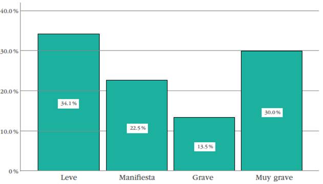 El 30.0 °% presentó una grave maloclusión, y el 34.1 °%, una maloclusión leve (figura 2). El puntaje IED promedio fue de 31.4 ± 11.6.