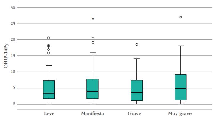El 0HIP-14Py aumentó conforme fue mayor la severidad de la maloclusión (figura 3), aunque esta diferencia no resultó estadísticamente significativa (p = 0.496). Sin embargo, al evaluar por dimensiones, se encontró que la incapacidad psicológica (p = 0.028), social (p = 0.034) y minusvalía (p = 0.552) se incrementaron conforme la severidad, por lo que fueron estadísticamente significativas las dos primeras. En las demás dimensiones no se observó diferencia: limitación funcional (p = 0.826), dolor físico (p = 0.825) y malestar psicológico (p = 0.145).