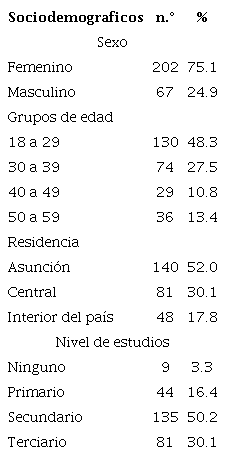 Formaron parte del estudio 269 pacientes, la mayoría mujeres, un poco menos de la mitad tenía menos de 30 años, un poco más de la mitad residía en Asunción y la mitad había culminado la secundaria (tabla 1).