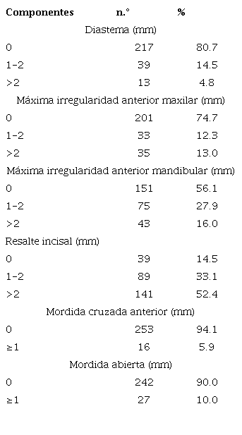 Se observó resalte incisal aumentado (>2 mm) en poco más de la mitad y una baja frecuencia de mordida cruzada anterior, mordida abierta y diastema (tabla 2).