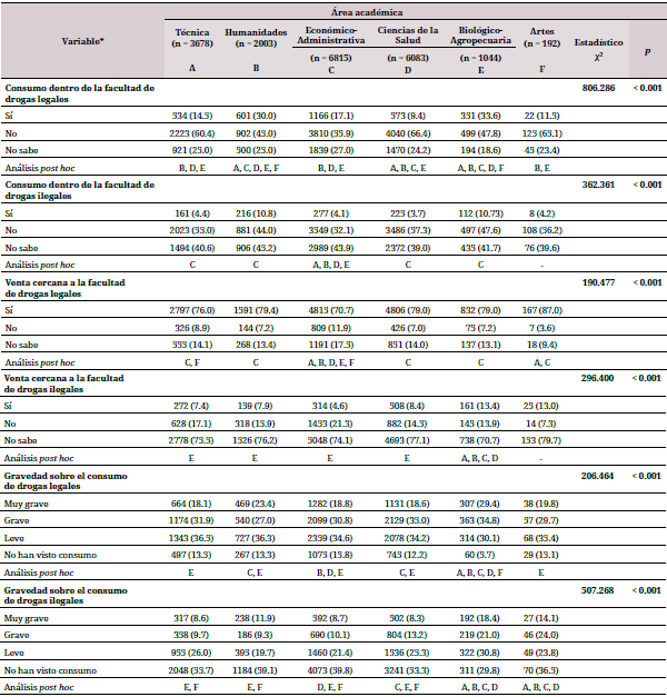 Al igual que en el caso anterior, pero analizado por área académica, todos los indicadores relacionados con la percepción de los estudiantes en las tres variables de interés -consumo y gravedad del consumo de drogas legales e ilegales, dentro de las facultades, además de venta de drogas legales e ilegales cerca de la facultad- resultaron estadísticamente significativos (tabla 3).