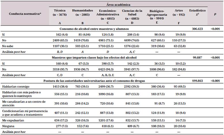 Como se puede observar en la tabla 3, el análisis post hoc muestra que las áreas Biológico-Agropecuaria (33.6 %%) y Humanidades (30.0 %%) son las que presentan un mayor número de estudiantes que percibieron el consumo de drogas legales dentro de sus facultades; en contraste, la que mostró un menor porcentaje fue Ciencias de la Salud (9.4 %%). En lo que se refiere a las drogas ilegales, la única área que se diferencia de las demás es la Económico-Administrativa (4.1 %).