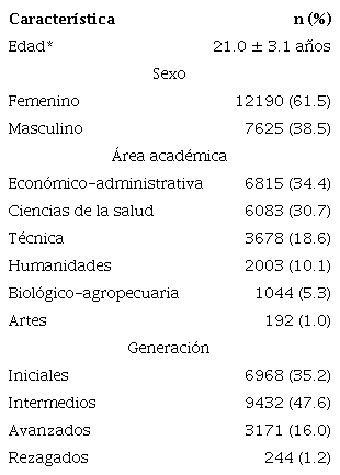 De los 19 815 estudiantes de licenciatura y tecnicatura formalmente inscritos en la universidad estudiada, 12 190 eran mujeres (61.5 °%), y 7625, hombres (38.5 °%); con una edad promedio de 21.0 ± 3.1 años. De los participantes, el 65.1 °% estaban adscritos a las áreas económico-administrativa y de ciencias de la salud y el 82.8 °% eran estudiantes que cursaban semestres iniciales o intermedios (tabla 1).