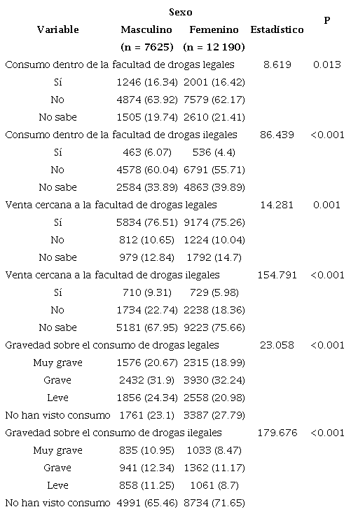En lo que corresponde al análisis de la percepción de los estudiantes sobre el consumo, venta y gravedad del consumo de drogas, en su facultad, según sexo, la tabla 2 muestra que todos los indicadores resultaron estadísticamente significativos (p < 0.05 con la prueba chi-cuadrado). En cuanto al consumo de drogas legales e ilegales dentro de su facultad, la mayor parte de los hombres y de las mujeres opinaron que no se consumía (en cuanto a drogas legales, 63.9 °% y 62.1 °%, respectivamente; y 60 °% y 55.7 °% en ilegales). En lo que se refiere a la percepción sobre la venta de drogas legales cercana a la facultad, en su mayoría confirmaron esta práctica (76.5 % los hombres y 75.2 % las mujeres), contrario al caso de las drogas ilegales, ya que en mayor porcentaje mencionaron no saber sobre el tema (67.9 °% los hombres y 75.6 °% las mujeres).