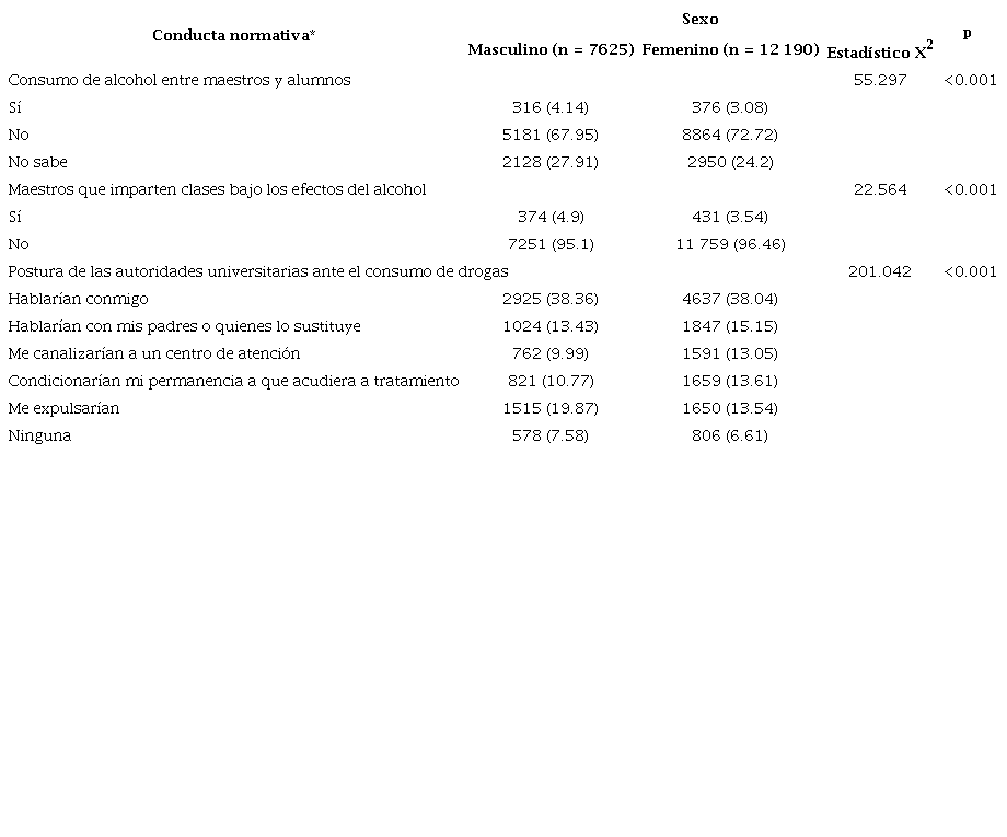 Asimismo, y a pesar de que la normativa universitaria prohíbe específicamente que los docentes consuman alcohol en horarios de clase o que impartan estas bajo los efectos de esa sustancia, el 4.8 %% de los estudiantes varones reportó haber observado esta práctica, a diferencia del 3.54 %% de las mujeres, que coincidieron con esta observación. Al igual que en el caso anterior, las diferencias fueron estadísticamente significativas = 22.564; p < 0.001).