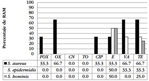 e los 15 pacientes se obtuvieron 12 aislamientos del género Staphylococcus: S. epidermidis (41.7 °%), S. hominis (25 °%), S. aureus (25 °%), y un aislamiento (8.3 °%) de S. warneri. Este último fue sensible a todos los antibióticos analizados, mientras que el S. aureus fue la especie que presentó la mayor RAM, principalmente a oxacilina, tetraciclinas y vancomicina. Las especies de ECN, S. hominis y S. epidermidis, fueron resistentes principalmente a eritromicina (figura 1). Los perfiles de RAM mostraron un aislamiento SARM y tres multirresistentes (tabla 2).