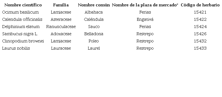 De acuerdo con el análisis cuantitativo de la información etnomedicinal, se seleccionaron siete plantas: laurel, albahaca, sauco, poleo, caléndula, belladona y achiote (hojas y fruto), por ofrecer el mayor factor de consenso entre informantes de plazas de mercado de Bogotá para el tratamiento de infecciones oculares 22. Estas provienen de varios municipios del país y se adquirieron de manera comercial en plazas de mercado de Bogotá y un ejemplar de cada una de las especies fue depositado en Herbario-Museo de La Salle (Bogotá, Colombia) para su identificación taxonómica (tabla 1).